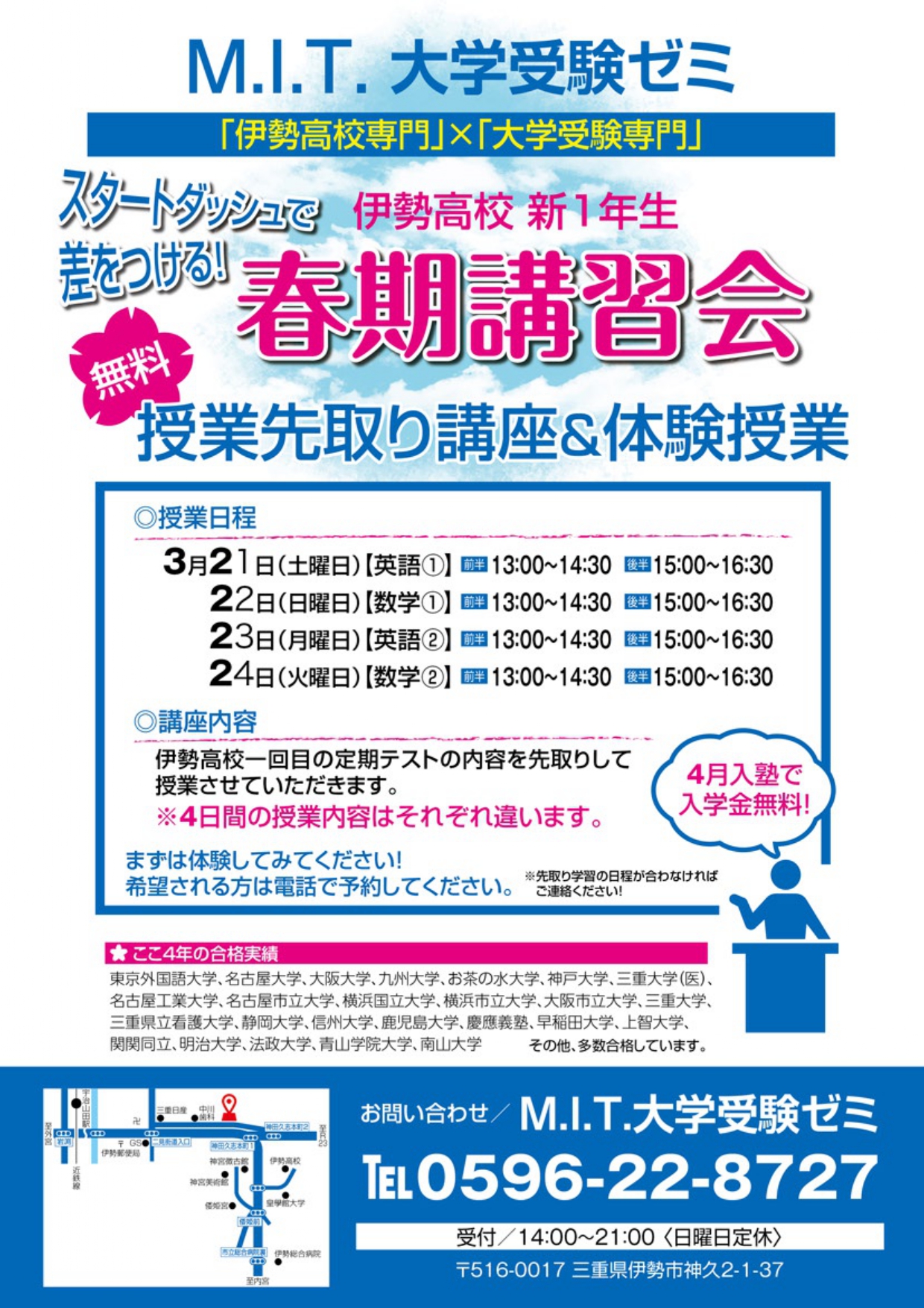2022年3月1日 / 最終更新日時 : 2022年3月1日 mit 新着情報 新年度パンフレット完成 M.I.T.大学受験ゼミ 2022 ご案内パンフレット完成しました。また新一年生対象 春期講習講座(体験授業)をご案内します。 M.I.T.大学受験ゼミ ISEらぼ三重県伊勢市「伊勢高校専門」の大学受験専門塾 TEL:0596-22-8727お問い合わせ & 体験予約FacebooktwitterHatenaCopy